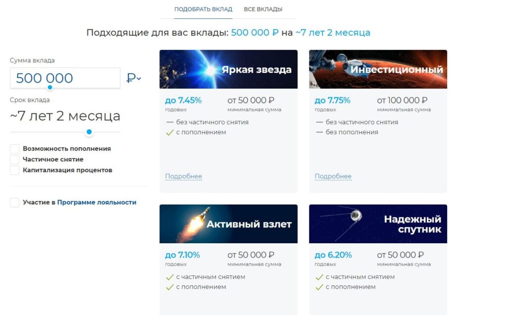 Минимальная сумма вклада – 50 тысяч рублей, срок от 181 до 1460 дней. Условия такие же, как и по предыдущим двум вклада. Отличие в процентной ставке – максимум 6,2% годовых. Зато появляется возможность не только пополнять вклад, но и частично снимать средства до минимальной установленной суммы.Новая высота.